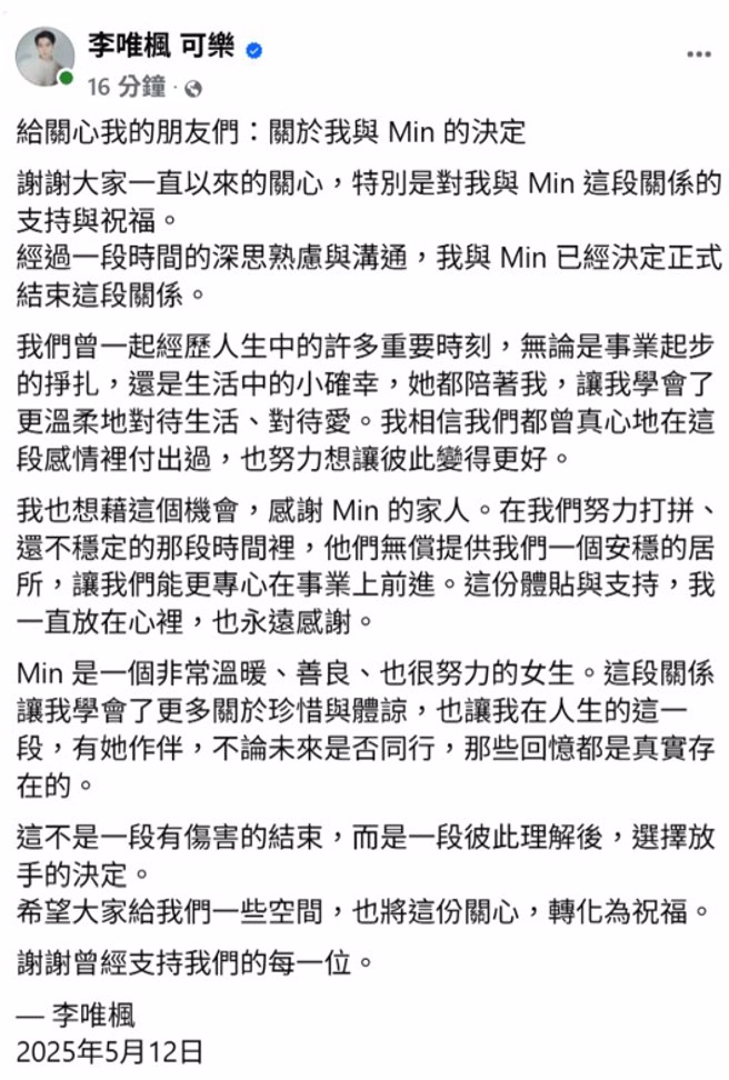 李唯楓昨(12)日在臉書發文,指出與女友Min經過深思熟慮的溝通後,決定正式結束關係,接著強調:「這不是一段有傷害的結束,而是一段彼此理解後,選擇放手的決定」,意味著雙方好聚好散,不過李唯楓這段發文,卻被週刊打臉,指出他其實和Min不是分手,而是離婚,導火線在於李唯楓不出家用、不做家事,讓Min忍無可忍選擇斬掉這段關係。